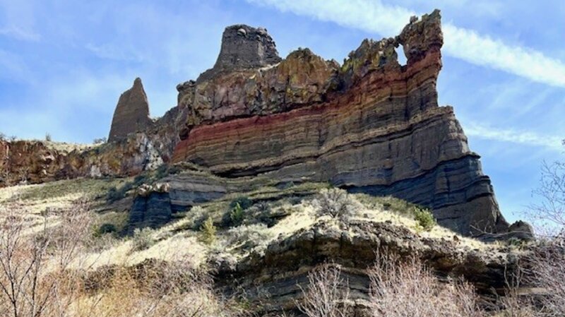 The early stages of the hike involves traveling next to the creek for a mile, the narrow path following the slope and involving short stretches of climbing followed by level areas. After a mile, the path steepens and hikers travel up the canyon slope and traverse above the river, with several areas close to the steep canyon cliff. Hikers should be careful here. In addition, the open high desert landscape with scattered juniper trees, sagebrush and fescue grass has limited shelter and sun exposure can be an issue with on warm summer days.