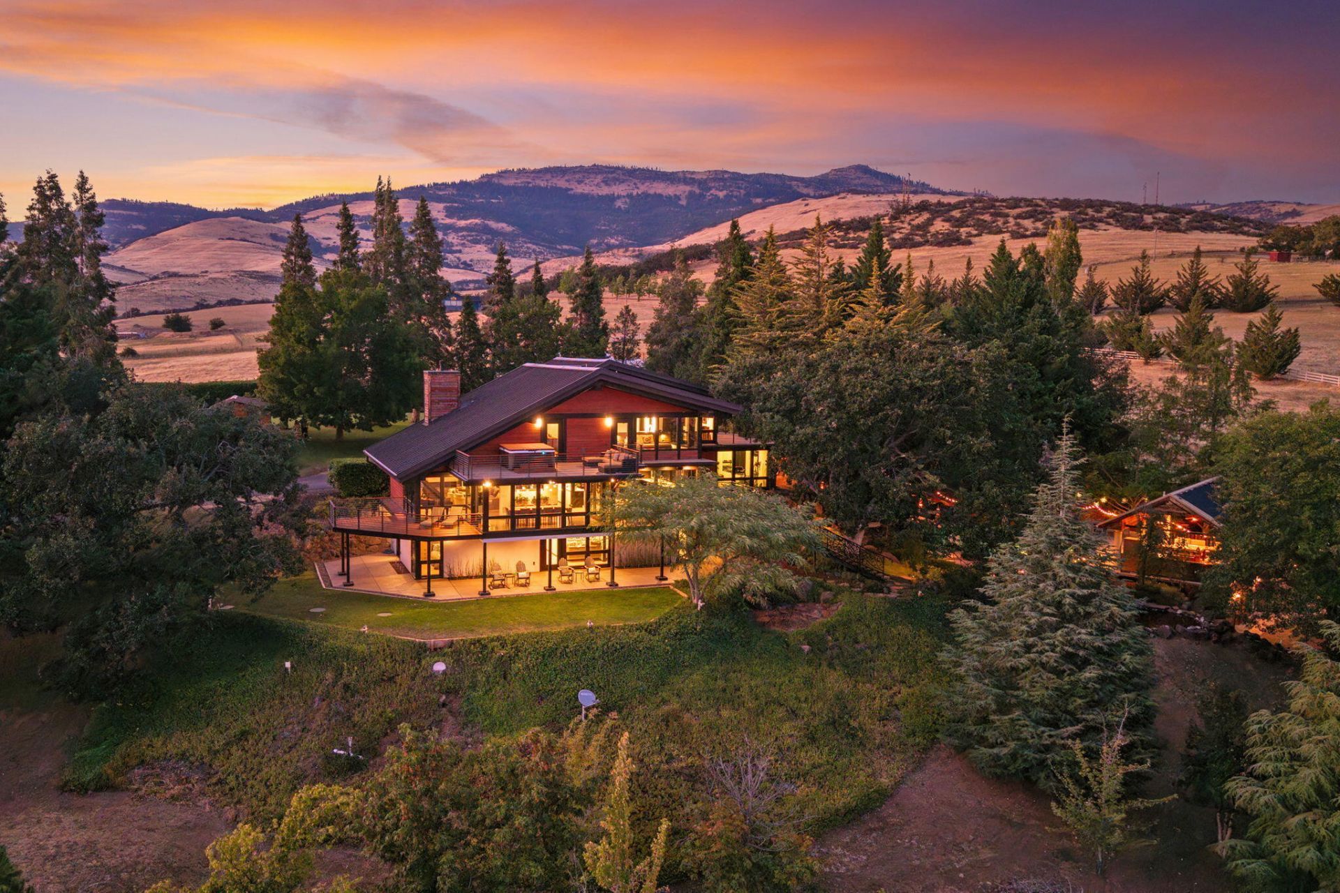 A private retreat setting where nature meets luxurious living. The 5BR/5BA Contemporary home captures the Siskiyou mtn range at every turn. The main level offers floor to ceiling windows, hardwood floors, living & dining room & Chefs kitchen appointed w/ island, wet bar, pantry, double ovens, wolf stove & more! Upstairs the main bedroom suite is an oasis unto itself w/views, decking & spa. A second primary suite, 2 addl bedrooms/bath & laundry room w/abundant storage are downstairs. Each room has custom finishes & exquisite views to ensure a lifestyle of privacy & relaxation. Outside youre met w/soothing soundscape of a tiered cascading creek, lagoon waterfall style pool, cabana area, outdoor kitchen & bath, for ease of entertaining. Equestrian, livestock or agricultural enthusiasts will delight w/the endless possibilities. Fruit trees, garden beds, greenhouses, chicken coop & workout room complete this singular estate. 1BD/1BA guest apartment is a bonus to this luxe property.