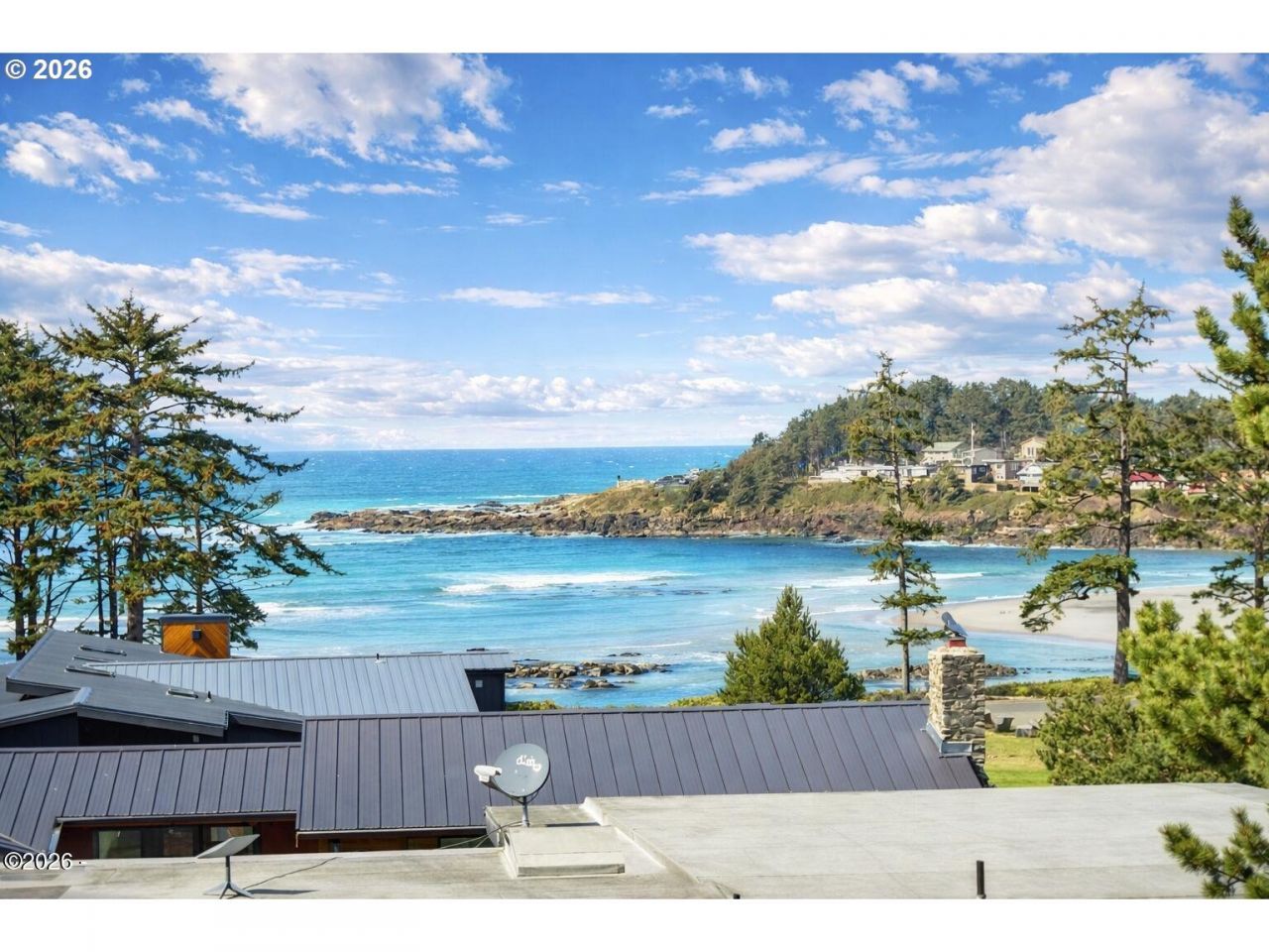 Ocean, bay, and rocky shoreline views define this exceptional coastal retreat. From the main living area and deck, enjoy ever-changing scenery-whales migrating, surfers riding the swell, and stunning sunsets that transition into evenings filled with distant boat lights and the soothing sound of the ocean. Built in 2016 and located just west of Hwy 101, this private 3-level home sits approximately one block from the shoreline and includes a deeded walking easement to Ocean Road with access to a sandy beach. A protected view corridor helps preserve the sweeping vistas. The main level features vaulted ceilings, expansive west-facing windows, and a floor-to-ceiling stone gas fireplace that anchors the space. The kitchen offers quartz countertops, cherry cabinetry, a large island, and a gas range-ideal for cooking and gathering. A custom staircase railing with an ocean-inspired design adds a unique architectural touch. The primary suite showcases both ocean and bay views and includes a soaking tub with water views, double shower, quartz vanity, and cherry cabinetry. The entry level provides a spacious guest bedroom, full bath with double shower, and access to the attached two-car garage with laundry and additional shop space. RV/boat parking is also available. The loft above provides flexible sleeping space, a half bath, and a vantage point to enjoy fireworks and the setting moon over Yachats Bay. Additional features include central heat and A/C, on-demand hot water, excellent insulation, and chair lift wiring. An outdoor hot/cold faucet is perfect after beach outings. The loft offers flexible sleeping space, a half bath, and elevated views.The landscaped yard includes hydrangeas, crocosmia, raised beds, and mature cedar trees. A detached studio (built 2023) with electricity and Wi-Fi is ideal for creative use. Located on a quiet dead-end street, this home offers privacy, natural beauty, and coastal living at its finest. Offered furnished if desired.