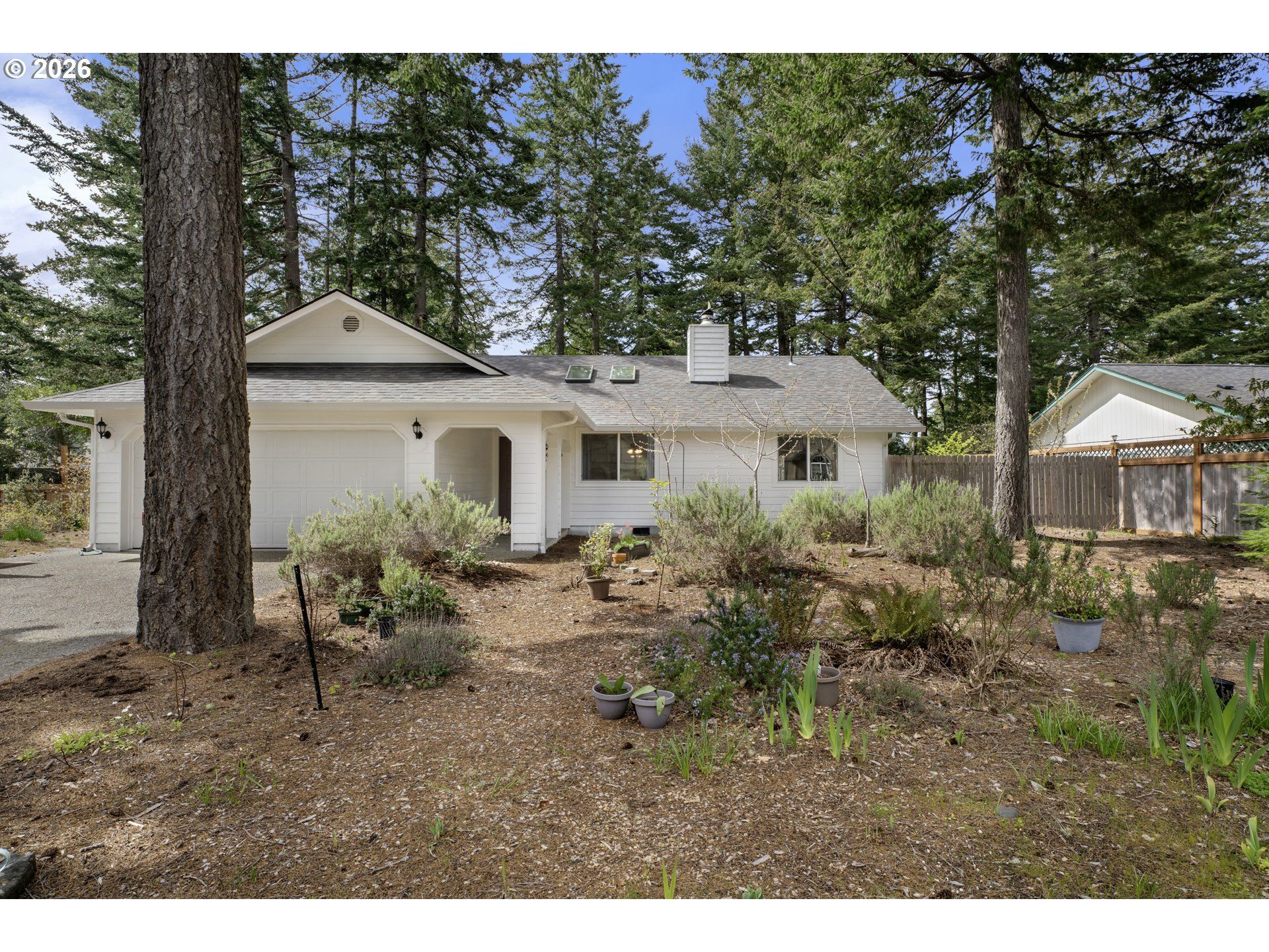 Tucked away on a quiet, tree-lined street in east Florence, this charming single-level home offers comfort, light, and easy living. With 1,386 square feet, the home features a spacious living room with vaulted ceilings, skylights that fill the space with natural light, and a cozy fireplace. The dining area just off the kitchen opens through a glass slider to a covered patio-perfect for year-round enjoyment. The primary suite includes a walk-in closet and private bath, while two additional bedrooms provide flexibility for guests or hobbies. A dedicated laundry room adds convenience, and the attached two-car garage provides ample storage and parking. Step outside to a peaceful backyard complete with additional storage for tools and gardening essentials.