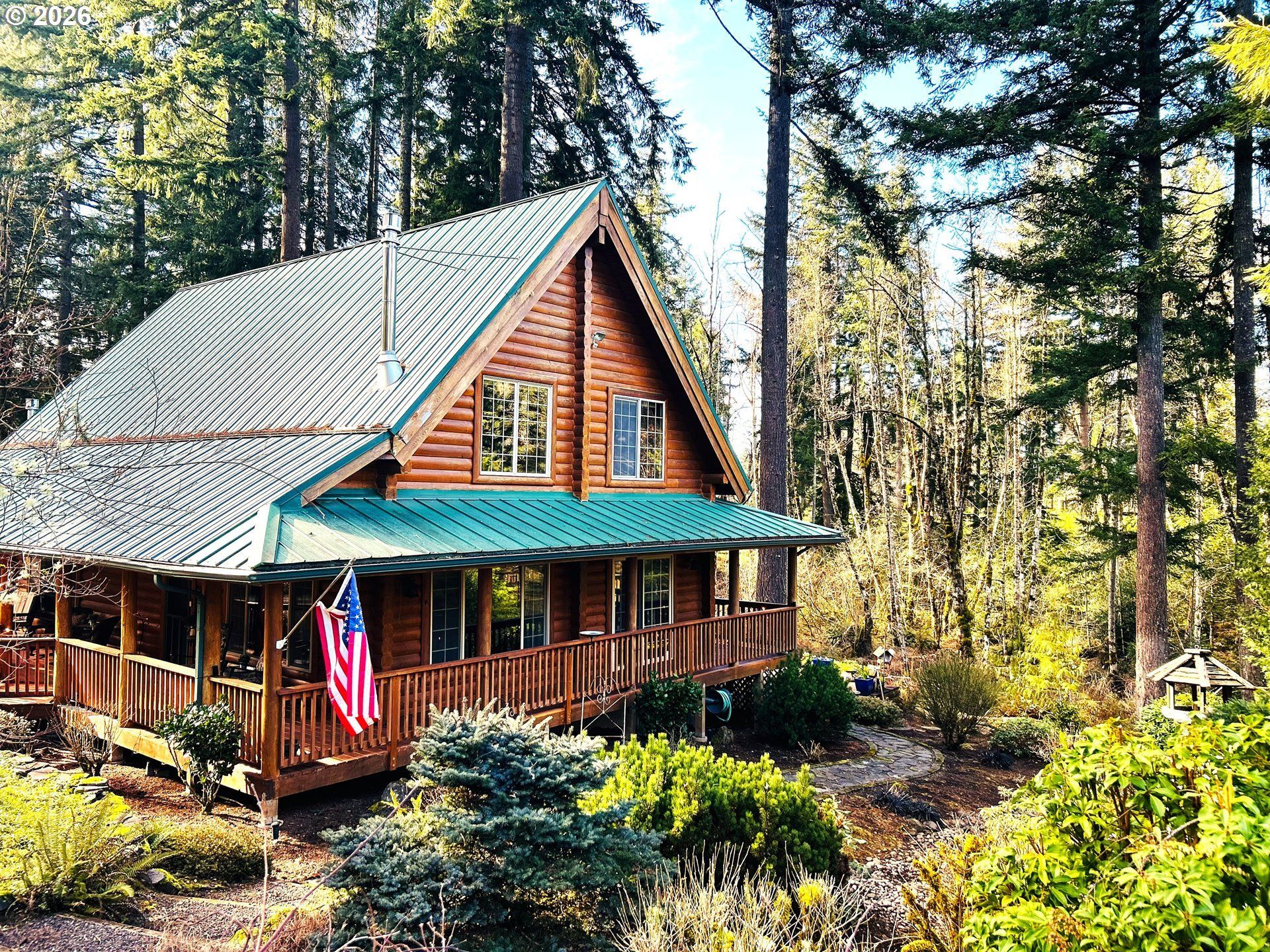 Welcome to your dream retreat! This stunning log cabin home nestled on a picturesque one-acre lot offers a rare blend of rustic beauty, modern amenities, and serene privacy. With over 3,000 square feet of thoughtfully designed living space, this residence is a perfect sanctuary for those seeking tranquility, space, and a deep connection to nature. Throughout the home, you'll find gorgeous wood floors, handcrafted trim, and exposed beams that complement the natural setting and classic log cabin charm showcasing a sunlit open concept living area with vaulted ceilings. The kitchen seamlessly integrates with the dining and living spaces, creating a harmonious environment for both everyday living and entertaining. A gas fireplace enhances the warmth and ambiance of the living area for a cozy feel or enjoy the newly installed Central AC for the hot summer days. Adjacent, a sizable bedroom with a walk-in closet offers comfort and convenience. The main level also includes a generous family room with a second gas fireplace, a full bathroom, and a dedicated laundry room. Upstairs, a versatile loft overlooks the main living area, providing flexible space for bonus playroom or home office. The expansive primary bedroom features a walk-in closet, a private sitting area near a full bathroom, offering a peaceful retreat for owners. Imagine waking up to the sounds of Bee Creek flowing through the entire property, the crisp morning air filled with birdsong, and sunlight filtering through towering trees. This home's wrap-around covered porch invites you to sip your morning coffee while watching deer and other wildlife wander through your yard. Whether you crave peaceful solitude or love to entertain, this property provides endless opportunities with two expansive decks to enjoy the outdoors year-round. Spacious covered parking with a built-in loft for extra storage. Schedule your private tour today and experience the magic of this extraordinary waterfront log cabin retreat.