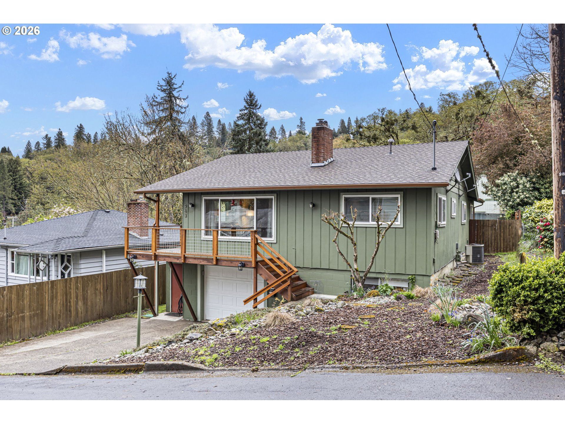 Set on a hillside at the end of a quiet no-thru street, this 4BD/2BTH home offers sweeping city and hillside views. Bright interior features Brazilian teak hardwood and tile floors, abundant windows, and an open-concept kitchen/living area with granite counters, island seating, and custom tile. A central brick fireplace with certified wood stove anchors the main living space. Multiple dining areas provide flexibility. Enjoy views from a spacious deck, covered patio, and terraced 3-tier backyard with garden beds. Three heat sources (electric, gas, wood). All kitchen appliances included. Minutes to downtown Roseburg.